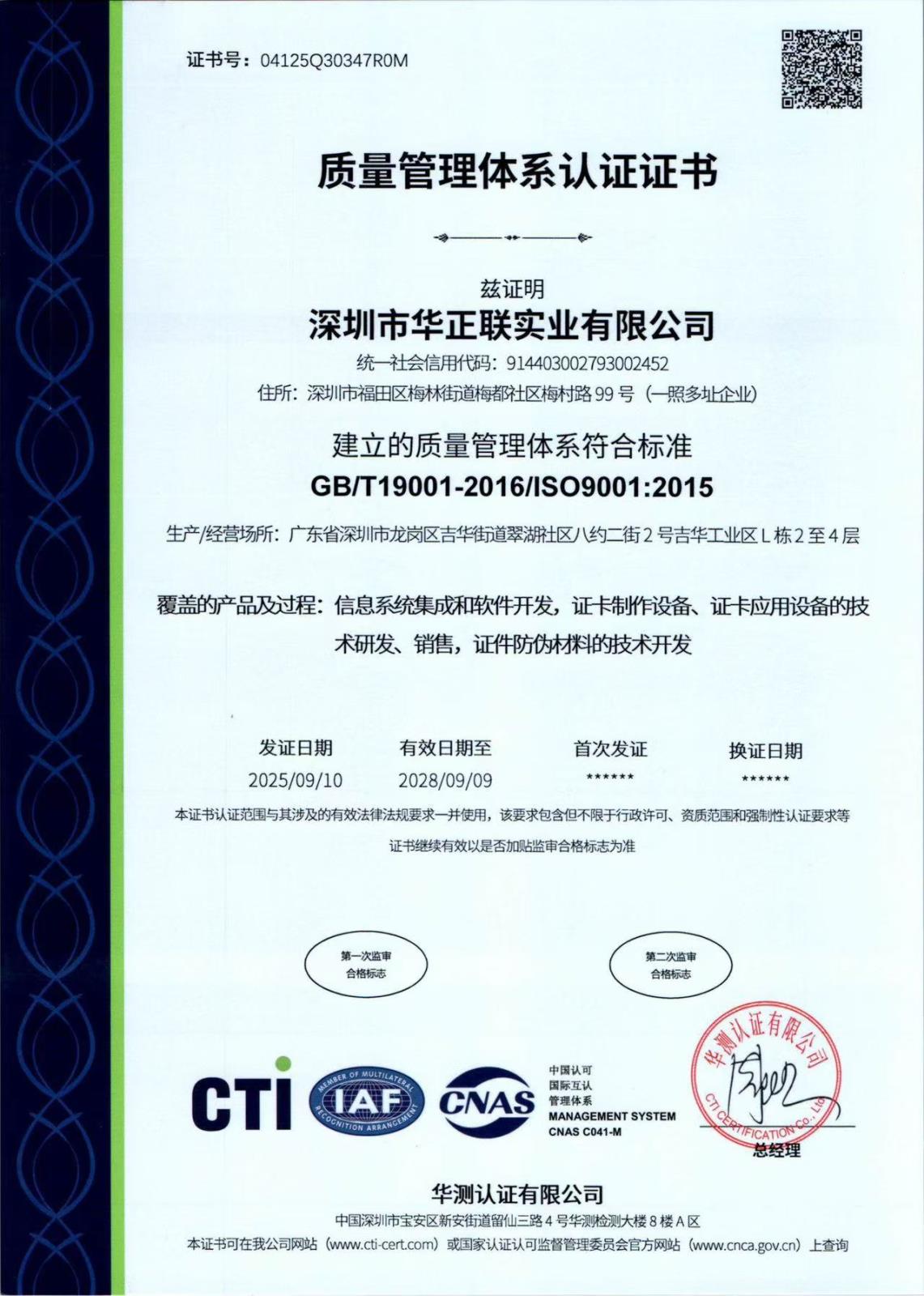 ISO9001品質管理體系證書