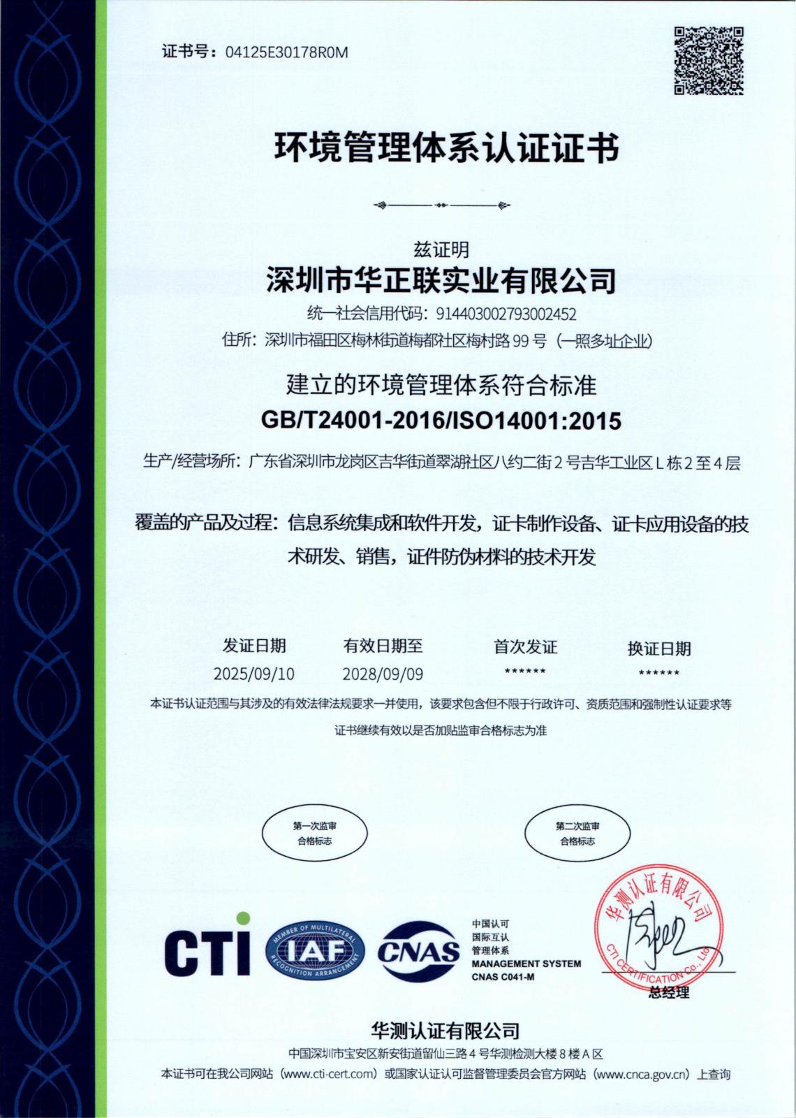 ISO14001環境管理體系證書