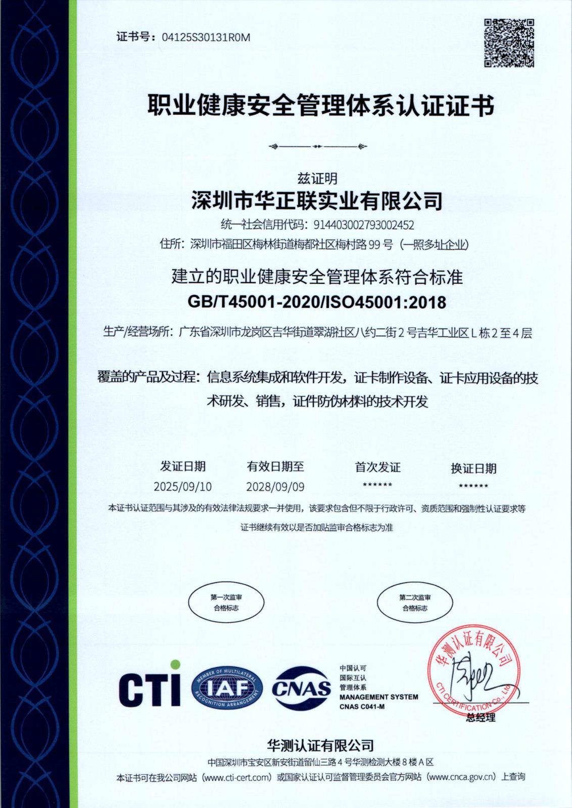 ISO45001職業健康安全管理體系證書